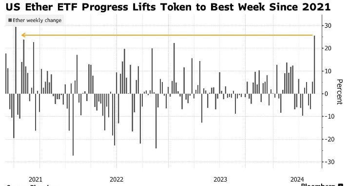 智通财经获悉,美国监管机构美国证券交易委员会(SEC)上周四批准了一项规则变更——这将为批准以太坊现货ETF铺平道路,随后押注以太币进一步上涨的押注正在加剧,尽管人们对这种产品的需求强度存在诸多疑问。数据显示,SEC的这一转变促使比特币在截至周日的七天内上涨了26%,这是自2021年加密牛市以来的最大单周涨幅。