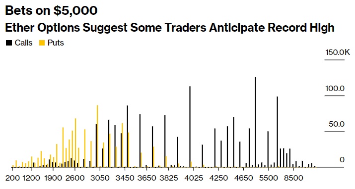 根据交易平台Deribit的数据,看涨期权押注的高度集中表明,一些交易员认为以太坊将攀升至5000美元甚至更高。目前的现货以太坊记录是2021年11月的4866美元。