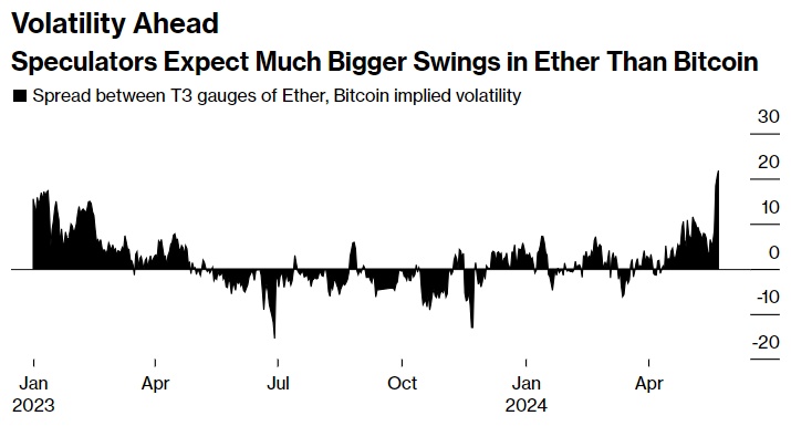 T3以太坊波动性指数(使用期权价格来预测代币30天内的预期波动)与比特币的类似指标之间的差距,至少是自2023年初以来的最大差距。这表明,投机者预计以太坊的波动幅度将大于比特币。