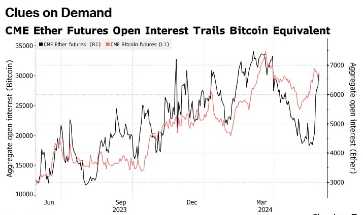一些分析师认为,对芝加哥商品交易所集团(CME)托管的期货的需求,是了解美国机构对受监管的加密货币敞口胃口的一个窗口。CME以太坊期货的未平仓合约(或未偿合约)水平正在上升,但远低于CME比特币期货,这表明机构对以太坊的参与减少,进而可能对未来的以太坊ETF也有所减少。