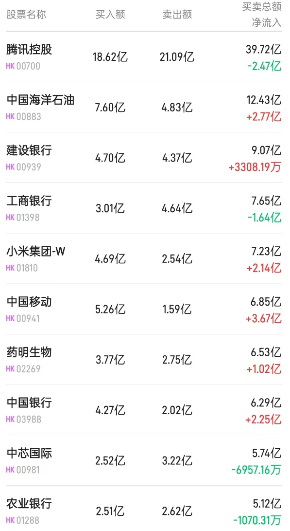 此外,小米集团-W(01810)获净买入4.65亿港元。而腾讯(00700)遭净卖出4351万港元。