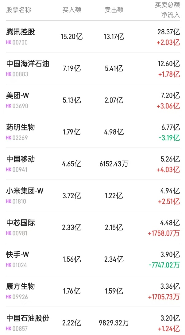 北水净买入最多的个股是中国移动(00941)、小米集团-W(01810)、中海油(00883)。北水净卖出最多的个股是工商银行(01398)、中芯国际(00981)、腾讯(00700)。