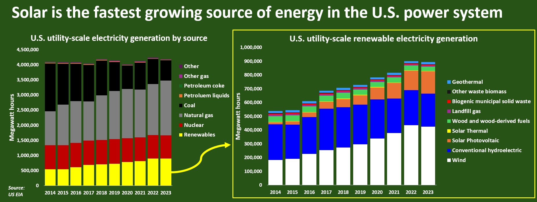 没有一种清洁能源能像太阳能那样,在创造机遇的同时也带来挑战。根据美国能源情报署(EIA)的数据,目前太阳能在美国电力输出中的总体占比可能很小,但正在快速增长,2018年至2023年期间的产量将增长155%。相比之下,同一时期内风力发电量和天然气发电量分别增长了56%和22.4%。