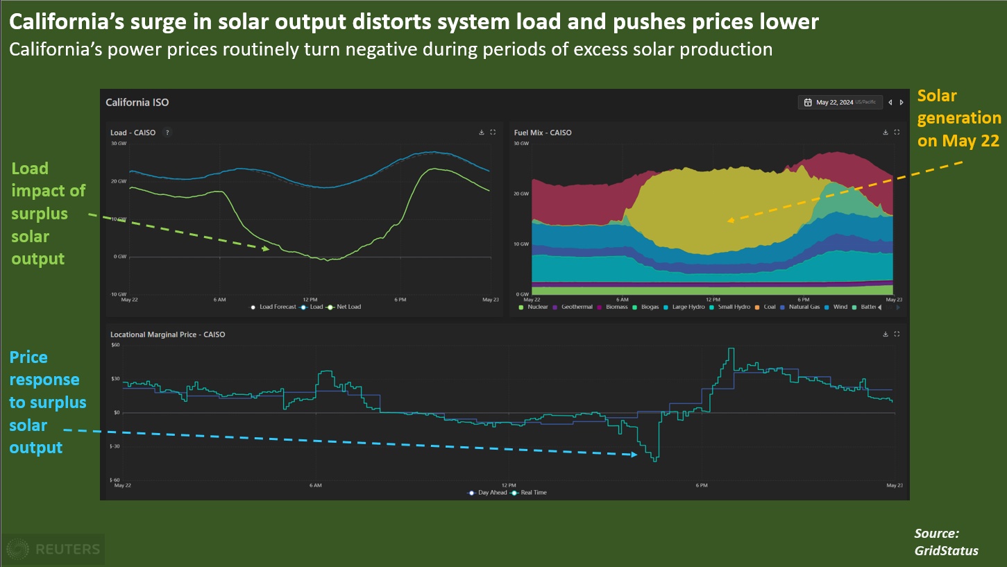 智通财经APP获悉,2023年,太阳能发电厂的发电量不到美国公用事业公司发电量的6%,但这一比例大大低估了太阳能在帮助电力公司加速能源转型方面所发挥的关键作用。原因在于,太阳能发电厂可能对系统电力流动产生破坏性影响,这迫使公用事业公司发展能力、迅速削减其他来源的输出,并储存剩余电力以备以后使用。