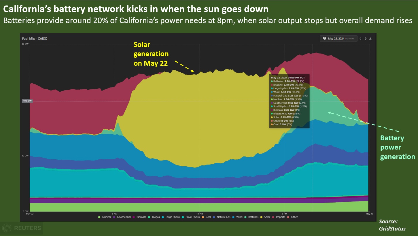为了减轻太阳能发电输出失控造成的系统不平衡的影响,加州的公用事业公司已经部署了公用事业规模的电池网络,以便在太阳能发电高峰储存多余的电力,并在系统需要时释放出来。尽管电池网络仍在建设中,但在太阳能发电停止和人们下班后家庭用电需求增加的高峰时期,电池网络为加州电力系统提供的电力已达到了20%左右。
