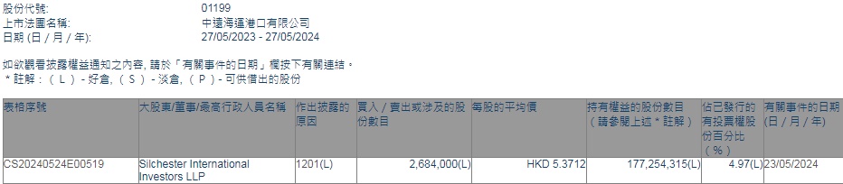 智通财经APP获悉,香港联交所最新资料显示,5月23日,Silchester International Investors LLP减持中远海运港口(01199)268.4万股,每股作价5.3712港元,总金额约为1441.63万港元。减持后最新持股数目约为1.77亿股,最新持股比例为4.97%。