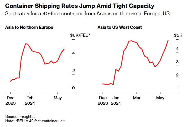 今年早些时候,远洋航运已经因为红海地区紧张局势而紧张不堪。也门胡塞武装对船只的袭击迫使航运公司只能绕道非洲南部,而非像以往一样通过苏伊士运河。全球第二大集装箱航运公司A.P. Moller-Maersk A/S估计,本季度从亚洲到北欧航线的运力损失为15%-20%。