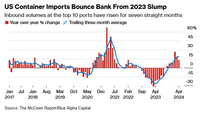 资深航运分析师John McCown表示,4月份,美国前十大港口的集装箱进口量连续第七个月同比增长,将过去三个月的平均增幅推高至19.1%。这是自2021年7月以来最强劲的表现,接近大流行期间需求激增的峰值。John McCown表示:“潜在的经济活动似乎是这些强劲增长的推动力。”