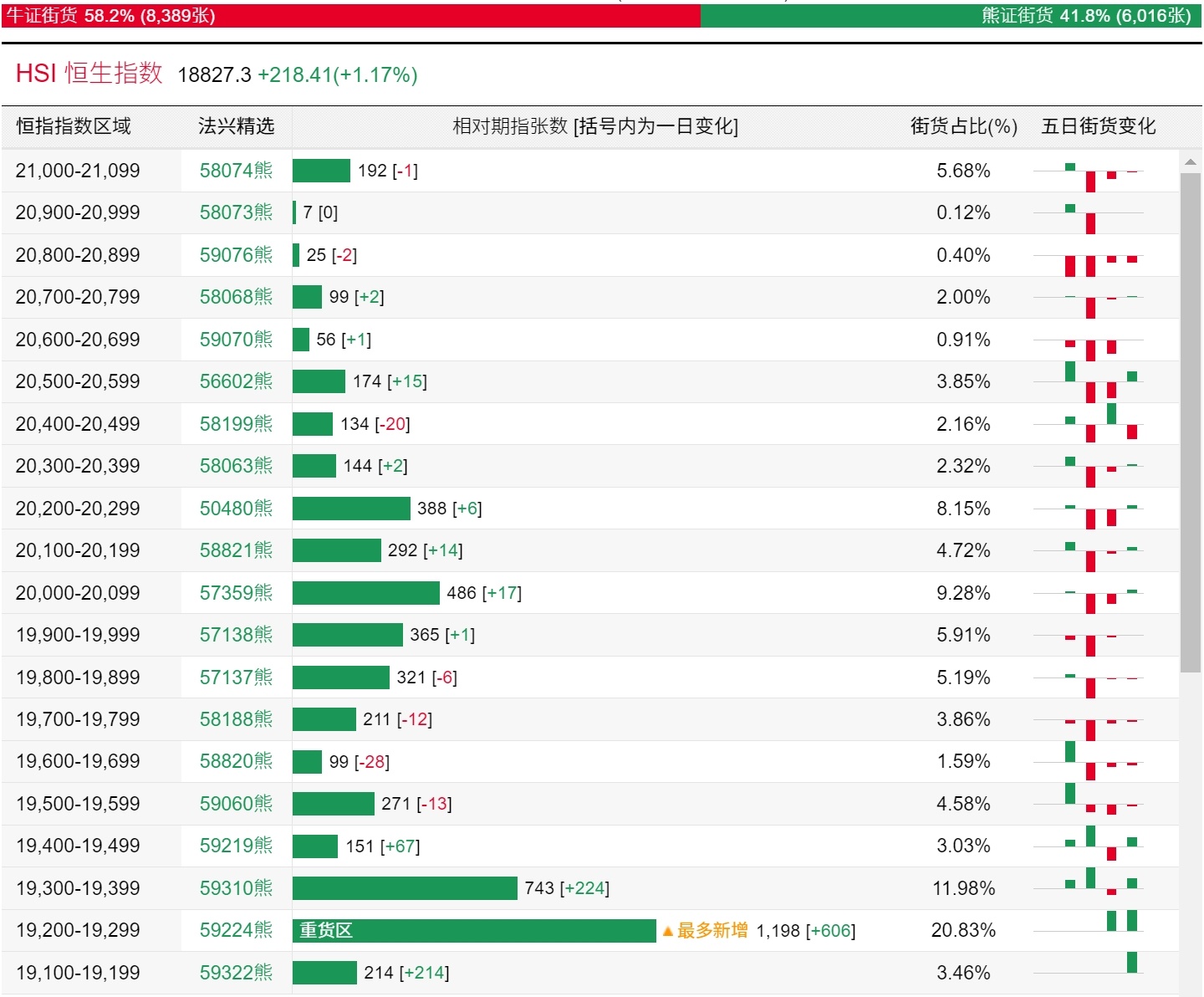 法兴恒指牛熊证街货分布图中的数据显示,熊证街货重货区和最多新增都在19200-19299区间,该区间最新熊证数量为1198张,较上一交易日增加606张。