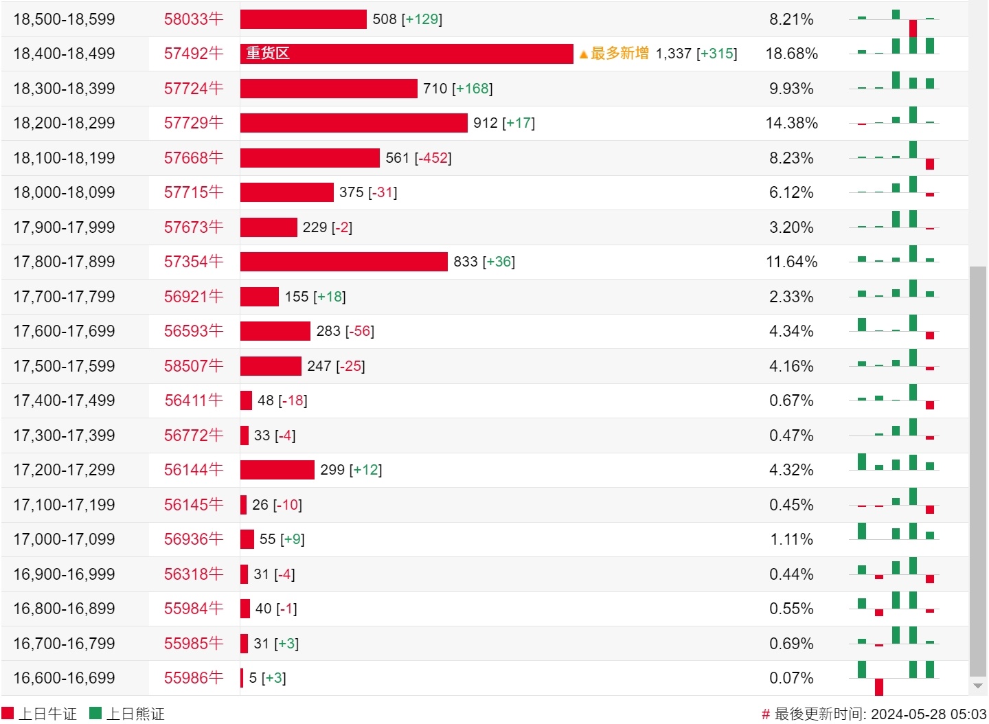 牛证街货重货区和最多新增都在18400-18499区间,该区间最新牛证数量为1337张,较上一交易日增加315张。