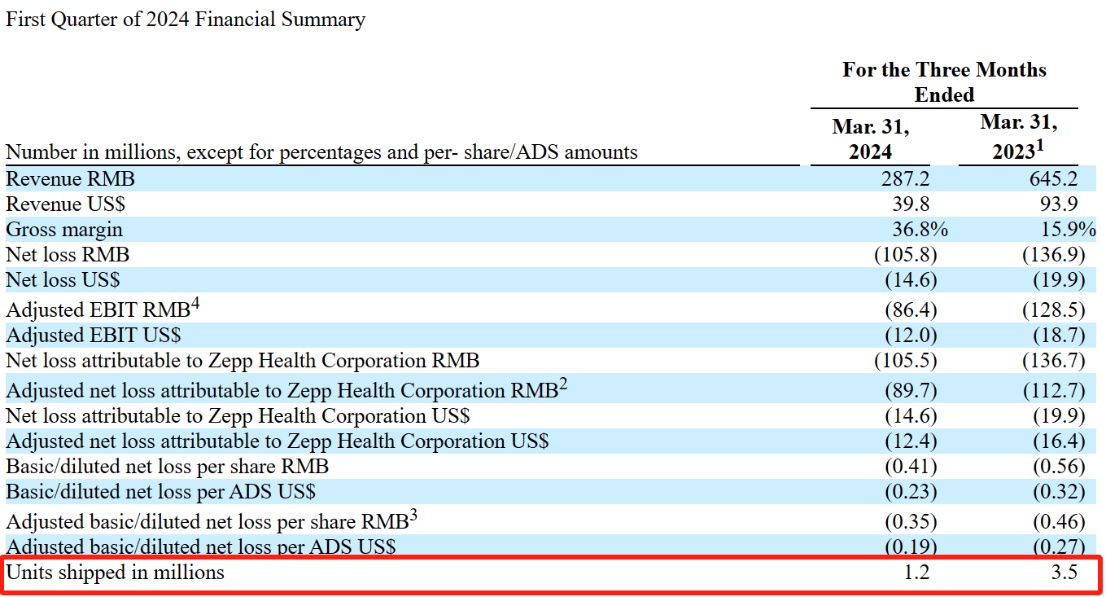 营收缩水就意味着华米在出货量上的进一步下滑。从往期出货量来看,2021年至2023年,华米产品出货量分别为3610万、2030万和1210万,分别同比减少21%、43.80%、40.39%。