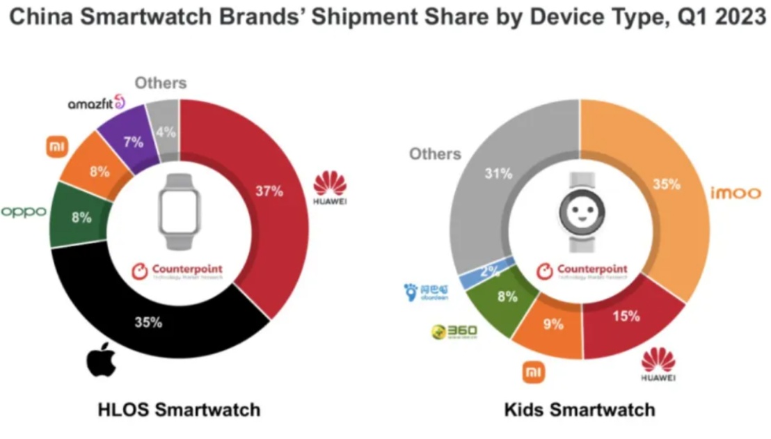 据市场调查机构Counterpoint Research公布的报告信息可以看到,智能手表与手机品牌的强关联。2023年Q1季度,排在前列的苹果、华为、OPPO和小米,无不都是有着手机这一终端产品,并且对应的销量也是排在头部。相比较下,没有手机产品的品牌国内最高排名也仅为第五。