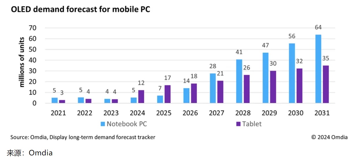 智通财经APP获悉,据Omdia的《显示面板长期需求预测跟踪报告》,预计2023年到2031年期间,移动PC市场对OLED显示屏的需求将以37%的年复合增长率(CAGR)增长。这一激增显示了越来越多的品牌选择在其高端笔记本电脑和平板电脑上采用OLED面板的趋势。