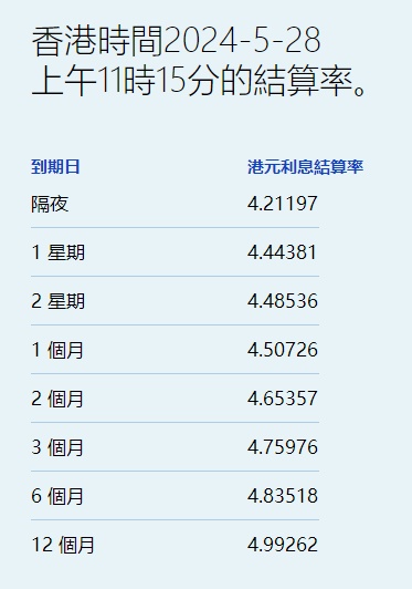 智通财经APP获悉,5月28日,港元拆息个别发展,其中,隔夜息结束两连升,回落至4.21197%。与楼按相关的一个月拆息三连升,报4.50726%,为4月3日以来最高。