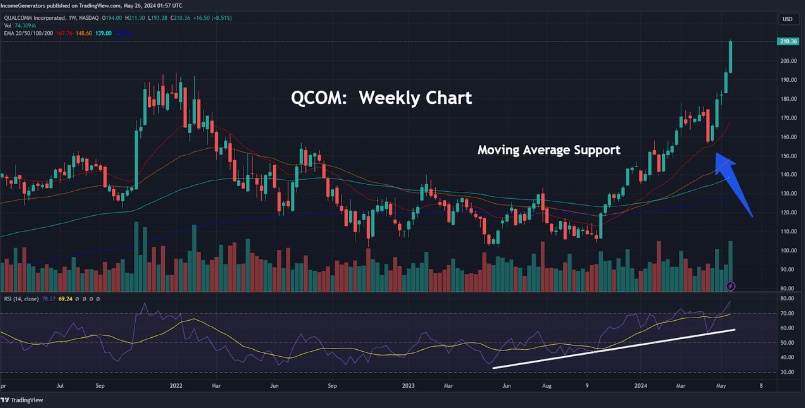 总的来说,这些季度数据相当令人鼓舞——看到高通股价继续走高并不完全令人惊讶。然而,该股目前上升趋势的强劲势头可能会让一些投资者感到惊讶,因为已经突破了月线图上重要的长期阻力位。具体来说,技术分析师已经将高通公司2022年1月的高点概述为该股的主要长期阻力位,我们可以从上图中看到,目前的上涨趋势在本月创下历史新高方面相对较少。考虑到2024年5月蜡烛图形态的强度,分析师认为该股飙升的看涨势头有可能持续下去。在相对强弱指数(RSI)的月度指标读数中可以找到指向这一积极方向的进一步证据,该指数尚未达到严重超买区域。此外,股价能够在100个月指数移动平均线附近找到强有力的支撑,分析师认为这种类型的价格行为可以限制股价未来的潜在下跌。