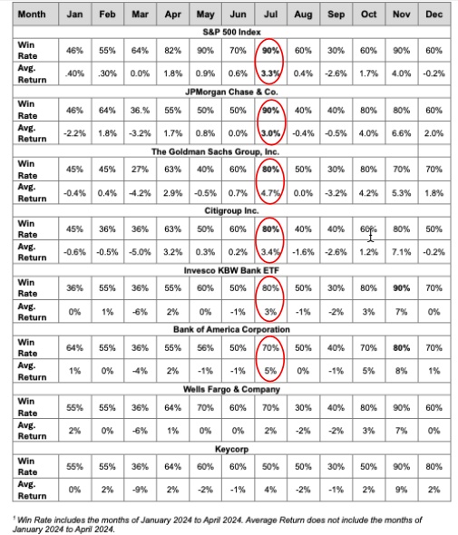 其中,摩根大通(JPM.US)比大多数银行获益更多。数据显示,在过去的十年里,标普500指数和摩根大通在10个七月里有9个上涨的,标普500指数的平均回报率为6.6%,而摩根大通的平均回报率为14.75%。对于摩根大通在过去十年的七月里几乎总是表现优异,一种解释是,厌恶风险的投资者希望在美联储的压力测试结果公布之前减持头寸,而当这些头寸在七月重新建立时,市场随后会做出积极反应。