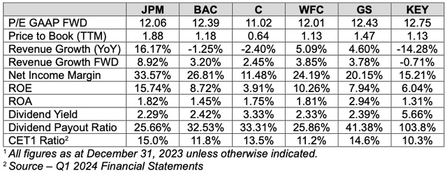 此外,摩根大通的股息收益率和派息率低于其同行,显然这是在保存资金以备不时之需。截至2023年底,该行的营业利润与风险加权资产比率从一年前的2.8%上升至3.6%,是同行平均水平的2.5倍。该行在截至2023年底的净利润率为33.57%,是同行中最高的。