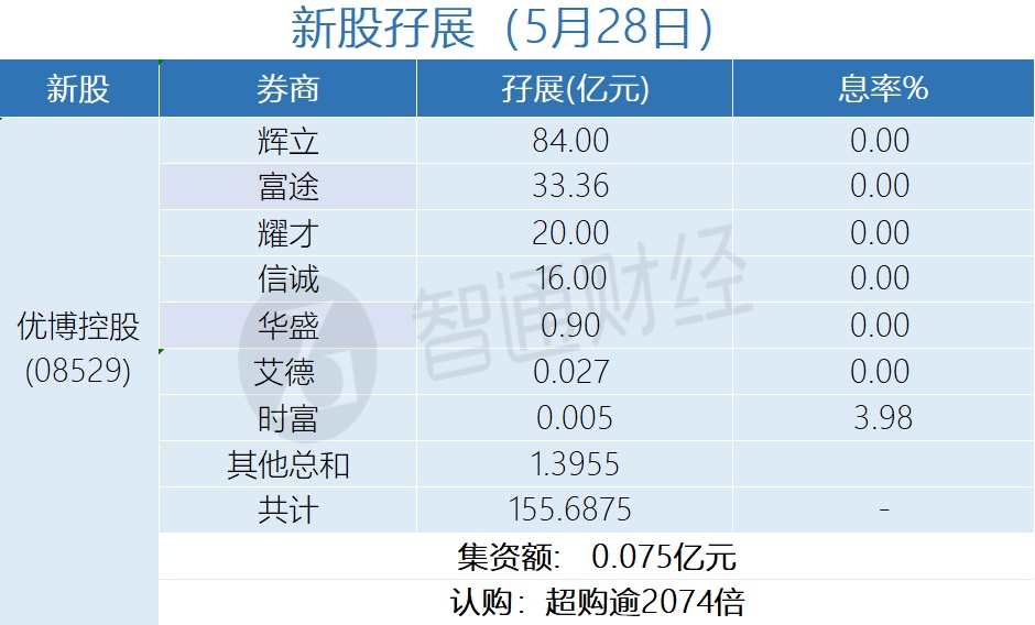 智通财经APP获悉,优博控股(08529)正在招股中。截至5月28日,辉立、富途等券商合计分别为优博控股借出孖展155.6875亿港元,认购超购逾2074倍。