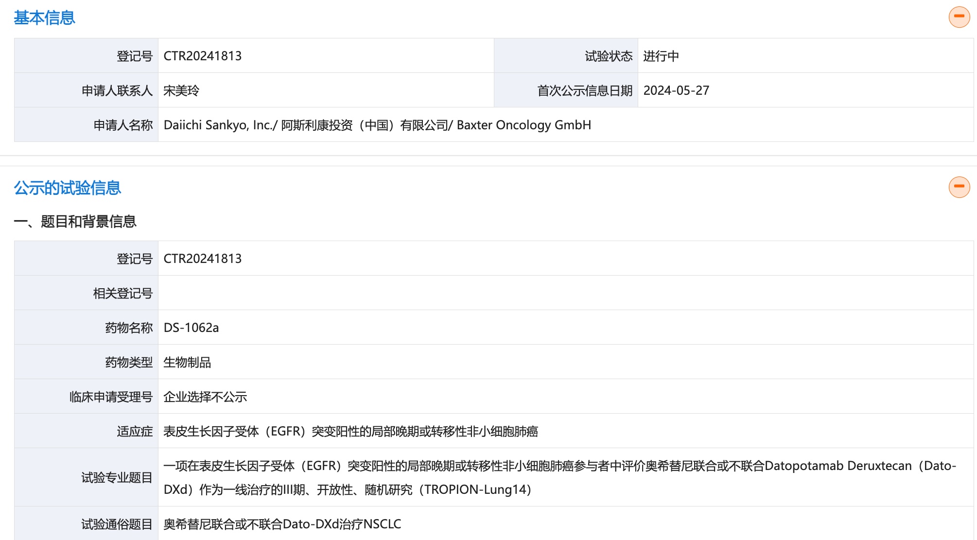 此外,第一三共/阿斯利康还在ClinicalTrials.gov平台上登记启动了一项Dato-DXd与奥希替尼联用二线治疗EGFR突变非鳞NSCLC的III期临床TROPION-Lung15研究(登记号:NCT06417814),计划入组630名受试者,预计今年8月完成首例受试者的入组工作。
