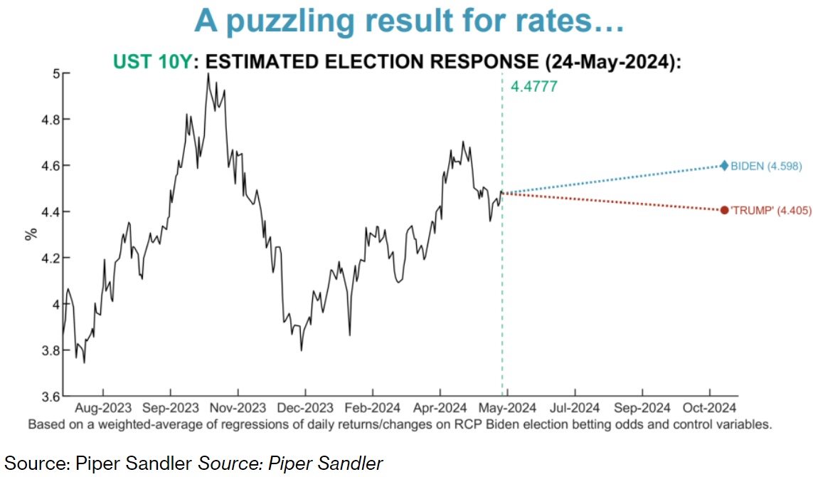 Piper Sandler警告道,他们最新的研究建立在“强有力的假设和明显不完善的指标”之上。他们还表示,结果在上个月发生了变化。今年4月,他们的估计显示,如果特朗普获胜,10年期美国国债收益率将上升11个基点。