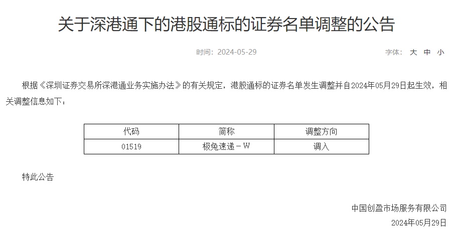 智通财经APP获悉,5月29日,据深交所公告,深港通下的港股通标的证券名单调整,调入极兔速递-W(01519)。根据《深圳证券交易所深港通业务实施办法》的有关规定,港股通标的证券名单发生调整并自2024年05月29日起生效。