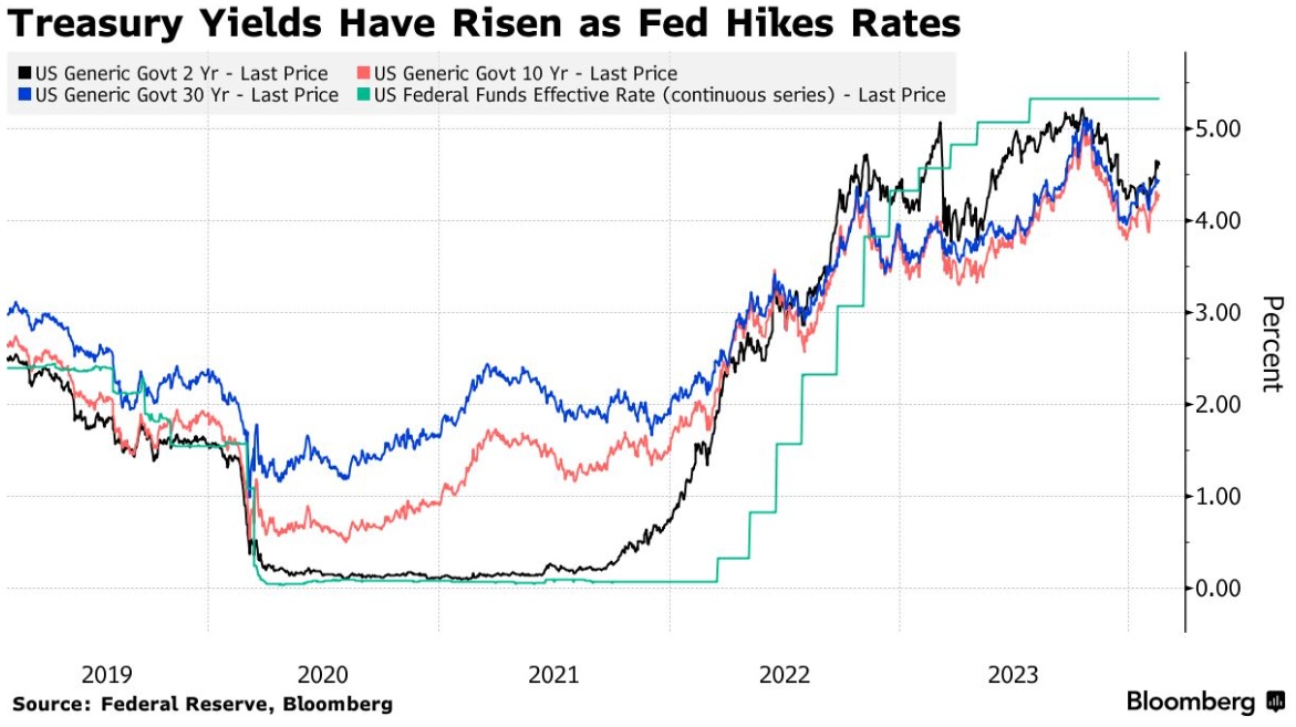 然而,这种缓解并没有持续太久,收益率又小幅回升。周二,10年期美债收益率为4.55%,仅比今年高点低19个基点。明尼阿波利斯联储主席卡什卡里周二表示,尽管美联储的政策立场是限制性的,但政策制定者并没有完全排除进一步加息的可能性。