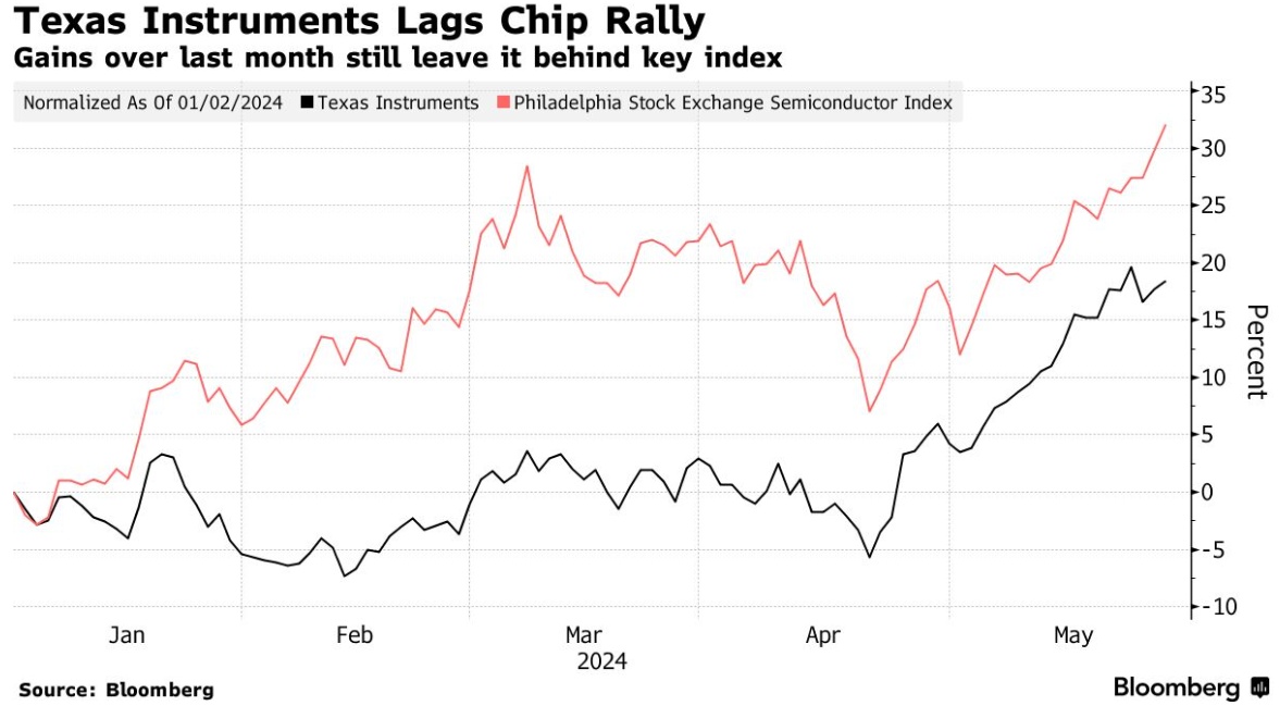今年以来德州仪器累涨17%,而芯片行业基准——费城半导体指数同期累涨近28%。投资者向英伟达等公司投入了大量资金,奖励它们与人工智能计算相关的订单激增。