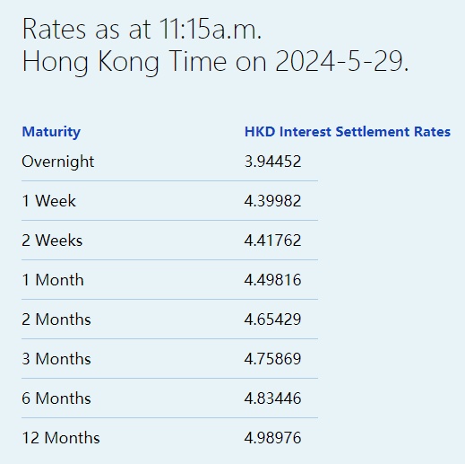 智通财经APP获悉,5月29日,港元拆息多数下跌,其中,隔夜拆息连跌两天,失守4%,低见3.94452%,为近一周新低。与楼按相关的一个月拆息中止三连升,报4.49816%。