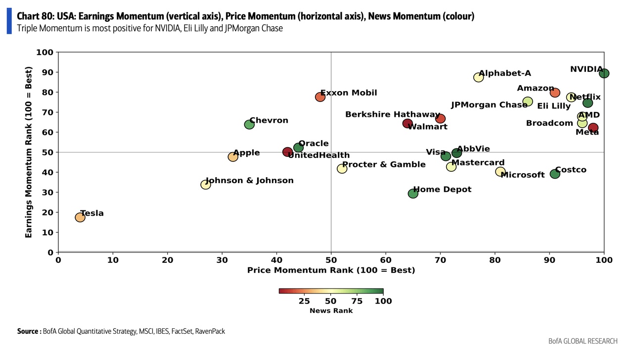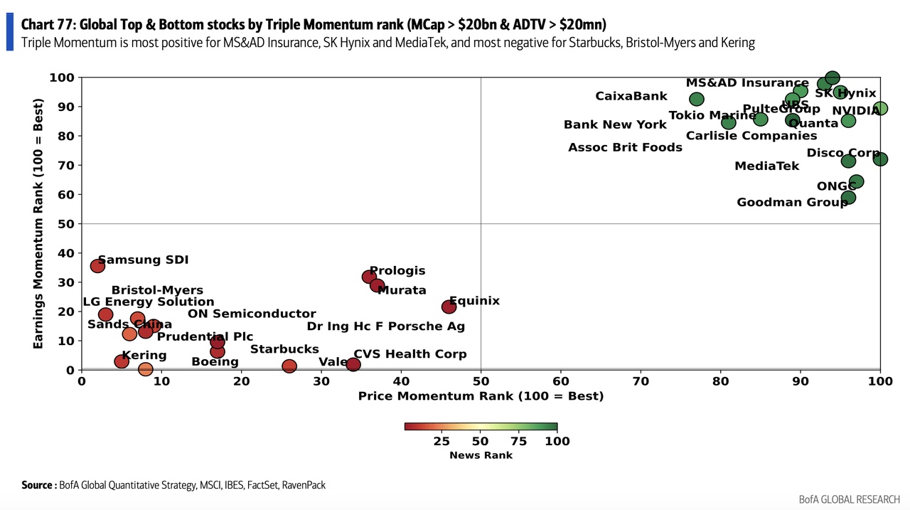 美银证券指出,在美国股市中,三重动量最强的是英伟达(NVDA.US)、礼来(LLY.US)和摩根大通(JPM.US)。放眼全球,三重动量最强的是日本MS&AD保险、韩国半导体公司SK海力士和中国台湾芯片供应商联发科,三重动量最弱的是星巴克(SBUX.US)、施贵宝(BMY.US)和法国奢侈品集团开云集团。