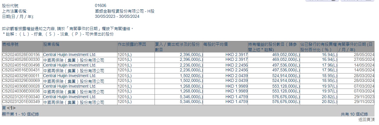 智通财经APP获悉,香港联交所最新资料显示,5月27日,中国再保险减持国银金租(01606)239.6万股,每股作价2.3917港元,总金额约为573.05万港元。减持后最新持股数目约为4.69亿股,最新持股比例占流通股16.94%。