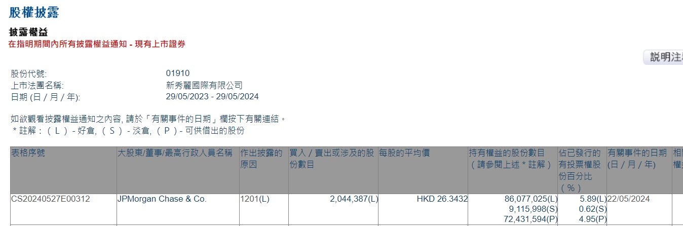 智通财经APP获悉,香港联交所最新资料显示,5月22日,小摩减持新秀丽(01910)204.4387万股,每股作价26.3432港元,总金额约为5385.57万港元。减持后最新持股数目约为8607.70万股,最新持股比例为5.89%。