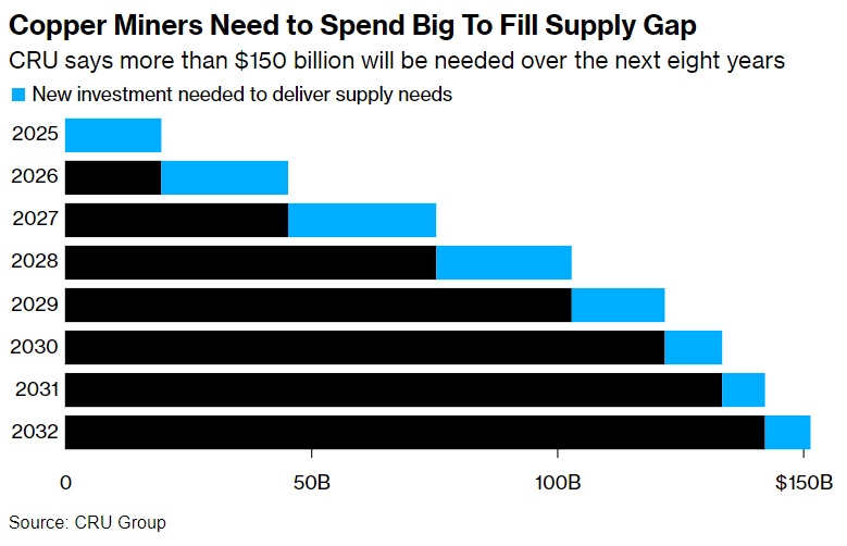 根据CRU Group的数据,现有矿山的产量将在未来几年大幅下降,为了满足该行业的供应需求,矿商将需要在2025年至2032年间投入超过1500亿美元。