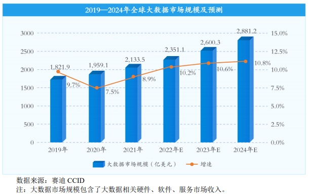 行业层面,根据赛迪CCID统计,全球大数据市场规模由2019年的1,821.9亿美元增长至2021年的2,133.5亿美元,复合年增长率8.2%;预计2024年全球大数据市场规模将达到2,881.2亿美元,未来三年复合年增长率约为10.7%。全球范围内运用大数据推动经济发展、完善社会治理、提升政府服务和监管能力正成为趋势,未来全球大数据市场将保持持续稳定发展。