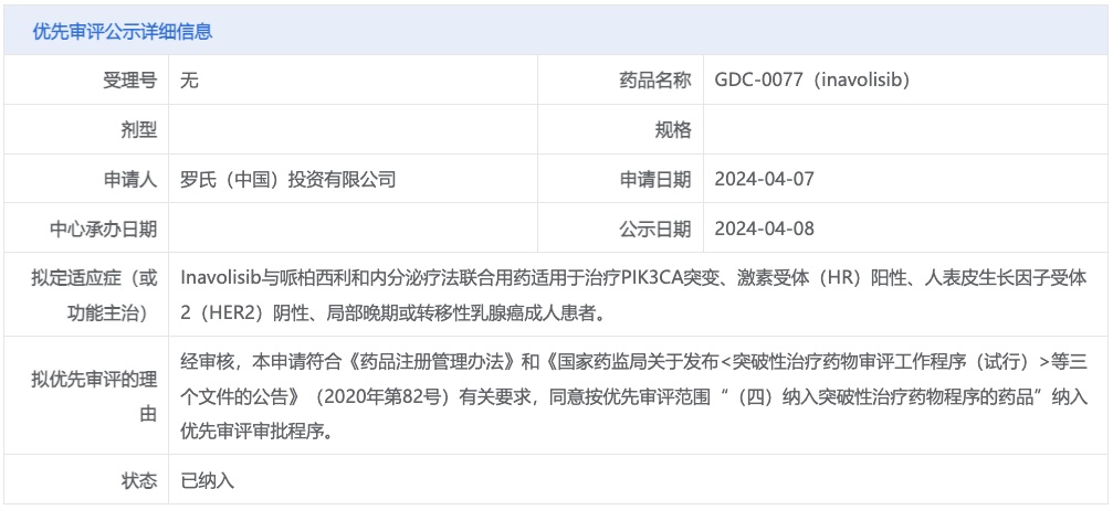 在国内,据CDE显示,Inavolisib也已被纳入优先审评。