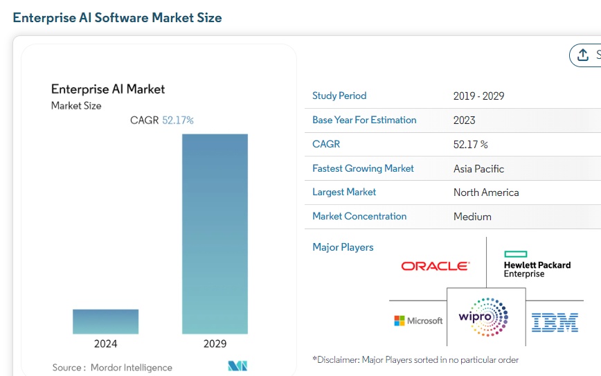 企业级AI可谓处于AI软件开发的“最前沿阵地”,预期数据方面,Mordor Intelligence研究报告显示,预计2024年到2029年,企业人工智能软件市场的总规模将以每年52%的惊人速度快速增长。
