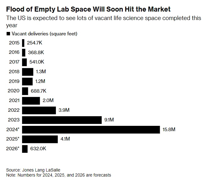 生命科学建筑的蓬勃发展造成了供应过剩。经纪公司仲量联行表示,预计今年将有近1600万平方英尺(150万平方米)的空置实验室进入美国市场,从而在波士顿、圣地亚哥和旧金山湾区创造出多余的空间。
