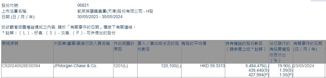 智通财经APP获悉,香港联交所最新资料显示,5月23日,小摩减持凯莱英(06821)12.01万股,每股作价59.3313港元,总金额约712.57万港元。减持后最新持股数目约为548.44万股,最新持股比例为19.90%。