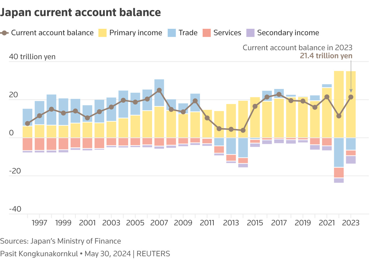 随着越来越多的日本公司开始收购外国公司以追求海外增长,日本现在通过增加来自证券和海外直接投资的主要收入盈余来抵消贸易逆差。但分析师表示,这些海外收入中的大部分被再投资到海外,而不是兑换成日元并汇回国内,这可能导致日元持续走弱。