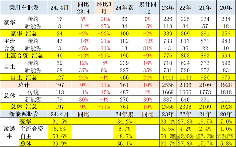 4月新能源车厂商批发渗透率40%,较2023年4月的34%的渗透率提升6个百分点。