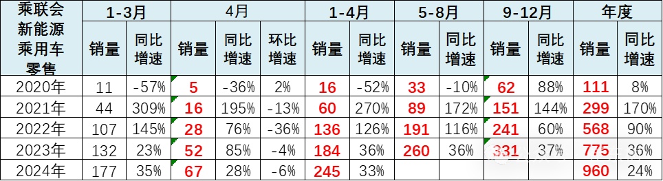2023年累计零售775万辆,同比增长36%。2024年1-4月的新能源车的零售245万辆增33%走势相对较稳,基本持平于2023年的36%增速,这是很不错的表现。