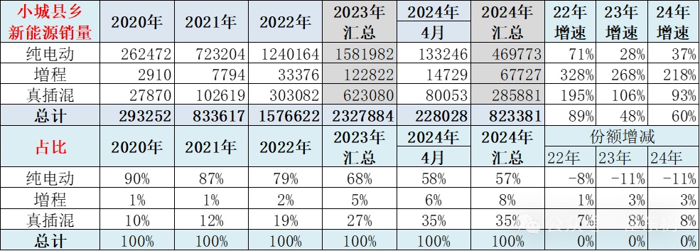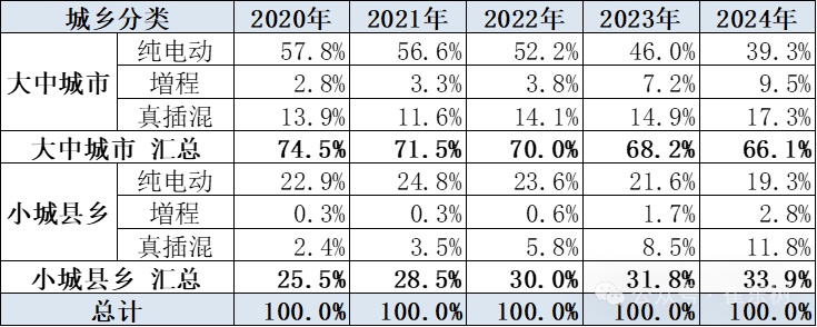 在小城县乡市场中新能源车的销售结构也从过去2020年90%是纯电动车,到2024年变成57%是纯电动车,小城县乡市场跟大城市的情况有逐步的接近的特征。