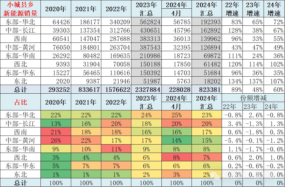 从小城县乡市场销量的新能源分布来看,在东北地区的销量增长速度相对是较快的。近期应该说西北还有东北表现都是不错的情况,华北地区表现也相对较强,而像中部黄河流域,还有东部华南地区总体表现是相对一般的情况。