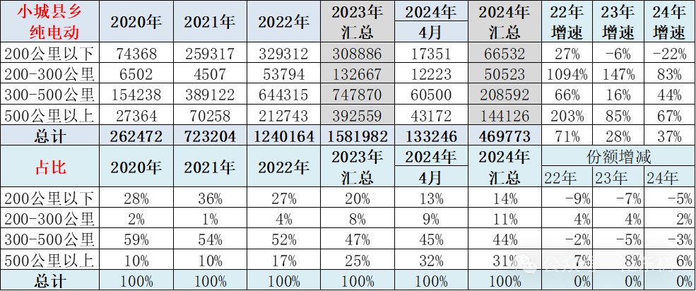 小城县乡市场目前纯电动车的销量结构从2020年的200公里以下占比28%,降到目前的2024年的200公里以下占比14%,占比出现了明显的下降的趋势,而且到四月份下降到13%的比例,200到300公里从2%的占比上升到11%的占比,逐步的上升趋势,但总体来看还是中高续航里程的产品提升,500公里以上的占比大幅的增长,所以呈现了中高端化的趋势。