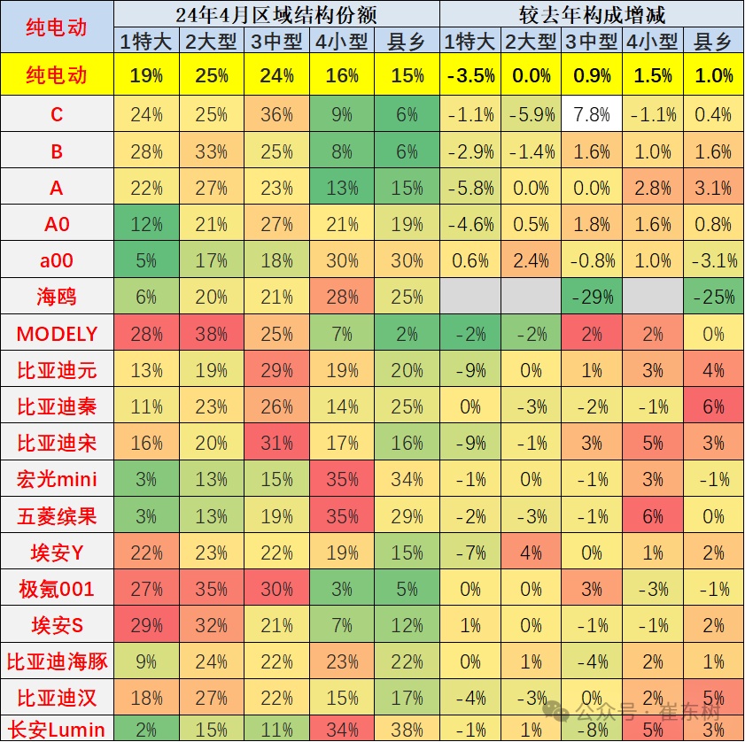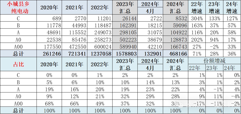 从车型结构来看,小城县乡市场的纯电动车A00级的占比大幅地下降,从2020年68%下降到2024年的36%,持续大幅地下降,目前下降了32个百分点的水平。
