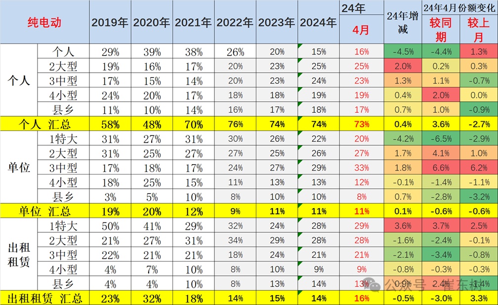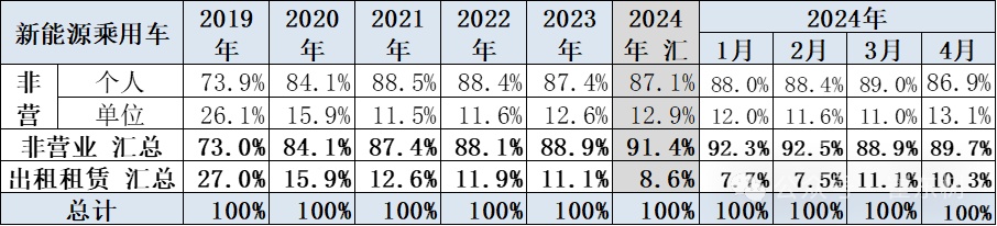 2018-2019年新能源乘用车的出租租赁类占比逐步提升,随后2020年开始的纯电动出租租赁的占比持续下降。2024年出租租赁的占比在8.6%, 4月的出租占比10.3%,私人消费走强。
