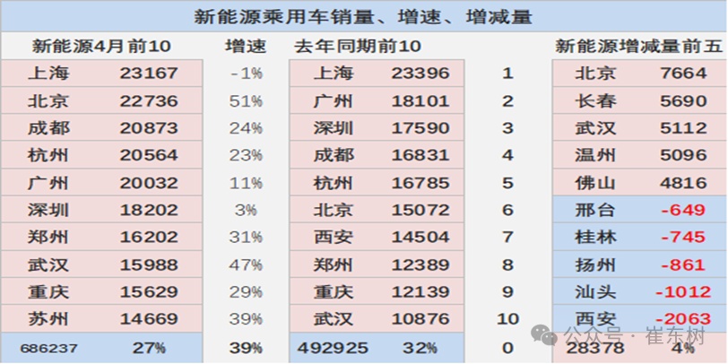 4月的新能源车下滑主力是西安等前期销量偏高的城市,总体影响不大。4月的新能源车增长主力是北京、长春等城市。下滑的是西安、汕头等市场区域。