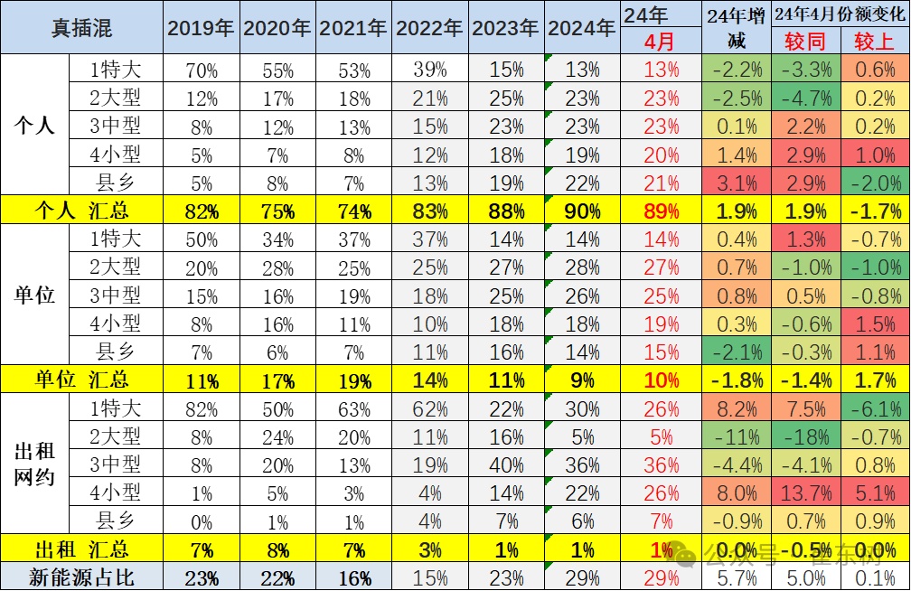 插电混动车型的单位用车和出租占比持续萎缩。插混出租租赁车型主要的需求在特大城市和大型城市市场,今年的特大型城市插混出租大幅萎缩。