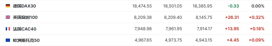 2. 截至发稿,德国DAX指数跌0.00%,英国富时100指数涨0.32%,法国CAC40指数涨0.18%,欧洲斯托克50指数涨0.09%。