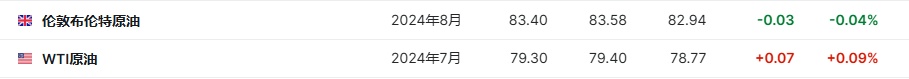 3. 截至发稿,WTI原油涨0.09%,报79.30美元/桶。布伦特原油跌0.04%,报83.40美元/桶。