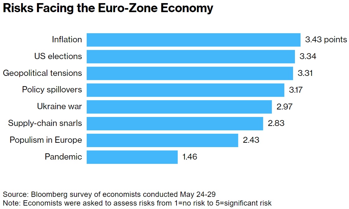 受访者仍然认为通货膨胀是欧元区经济面临的最大风险,其次是美国总统大选和地缘政治紧张局势的影响。